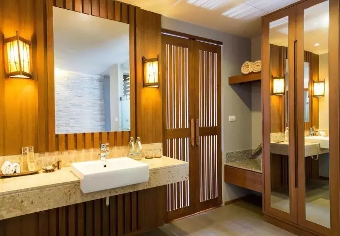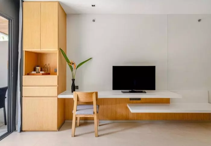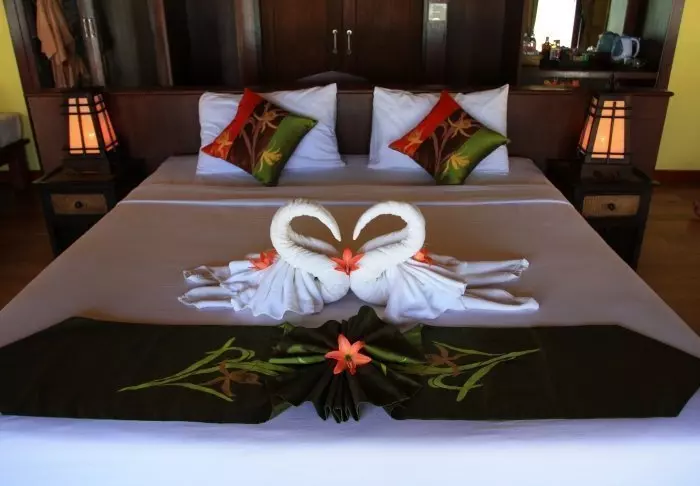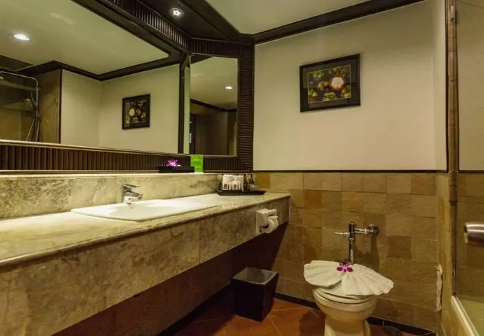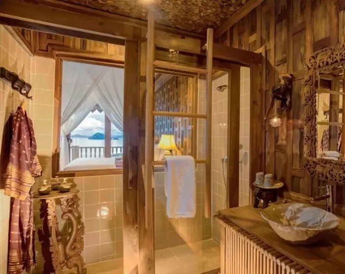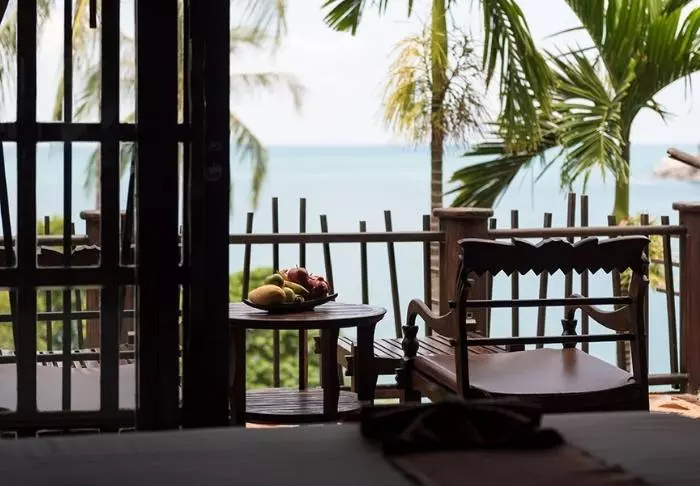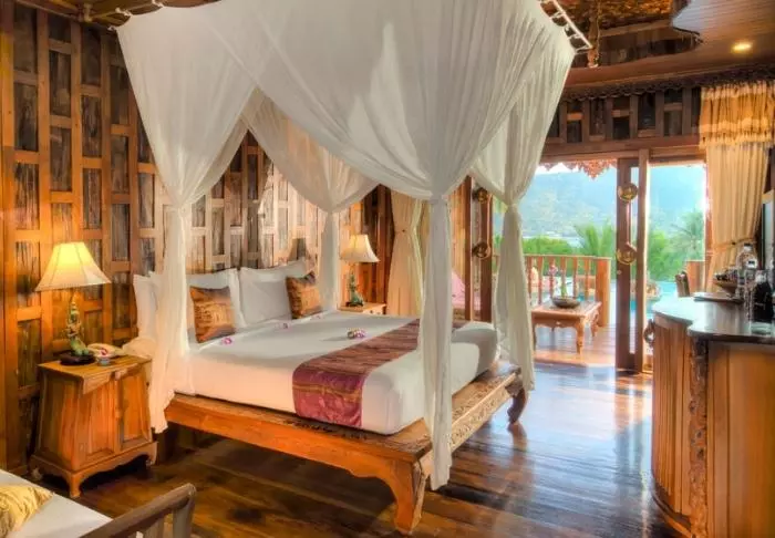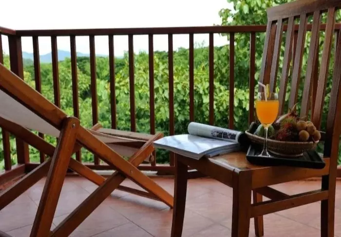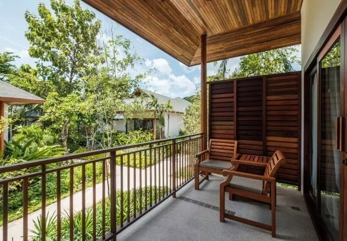 Rommene er også innredet i thai-stil med vakre treutskjæringer og flotte mønstrer på puter og tepper. Her er det TV, kaffe- og tefasiliteter, aircondition, safe, minibar, hårtørker – og en paraply, hvis det skulle komme et tropisk regnskyll. Alle rom har egen balkong.