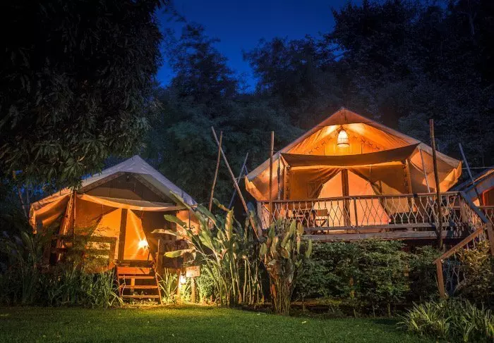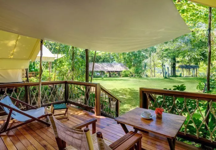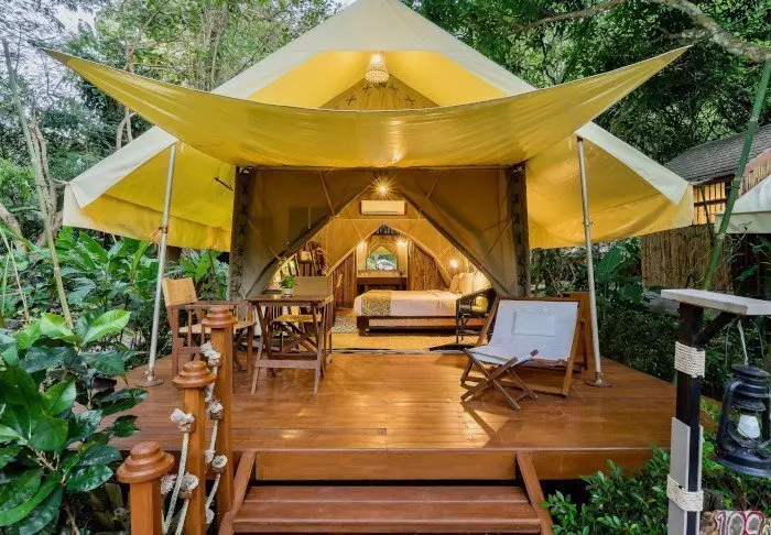 Leiren består av 38 luksuriøse lerretstelt på mellom 26 og 32 m² som er hevet en halv meter over bakken. Teltet har ordentlige senger, eget bad med varmt vann, hårtørker og toalettartikler samt egen veranda. Der kan du nyte stillheten og de frodige omgivelsene. Samtlige telt har dessuten Wi-Fi, aircondition, toalettbord/skrivebord, gratis mineralvann på flaske, kjøleskap og elektrisk kjele til te og kaffe. Etter klokken 22 skal det være stille i leiren – altså ingen høy musikk, kun jungelens lyder.
