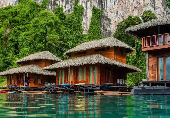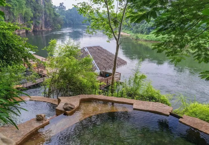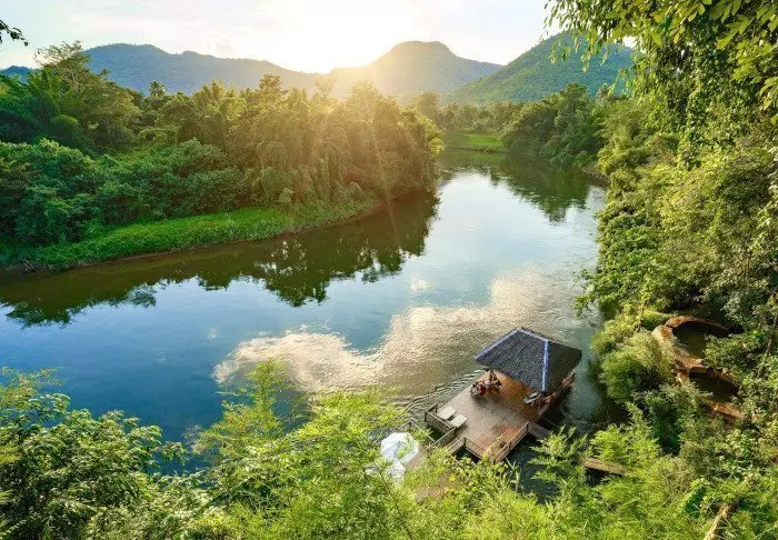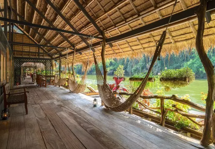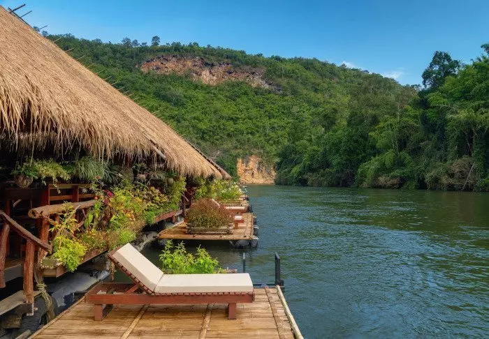 Det unike River Kwai Jungle Rafts er et flotell, et hotell bygget på en tømmerflåte. Dette er et helt unikt overnattingsalternativ. Flotellet ligger fast forankret på elven Kwai med en gangbro inn til bredden.