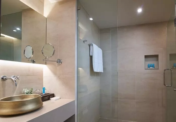 Rommene er lyse og romslige, og de er innredet med tekstiler i rolige jordfarger. De er utstyrt med moderne fasiliteter som Wi-Fi, aircondition, takvifte, minibar, sikkerhetsboks, gratis mineralvann på flaske, vannkoker for å lage te og kaffe, samt et garderobeskap. Rommene har også et fint bad med dusj, og du finner også toalettsaker, badekåpe, tøfler og bassenghåndklær for gratis bruk.
