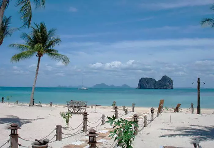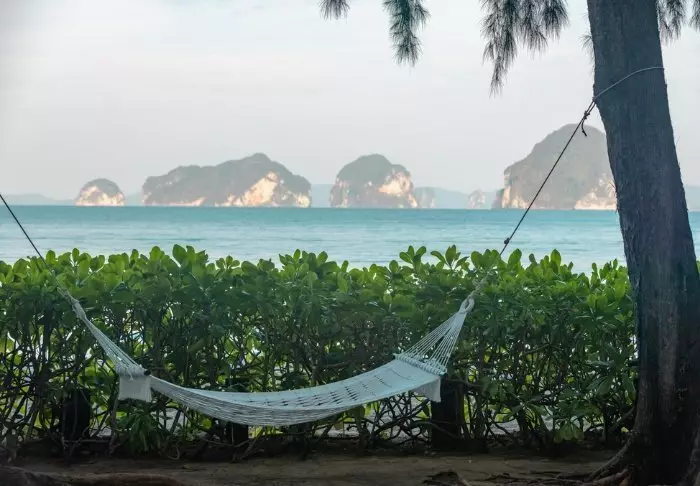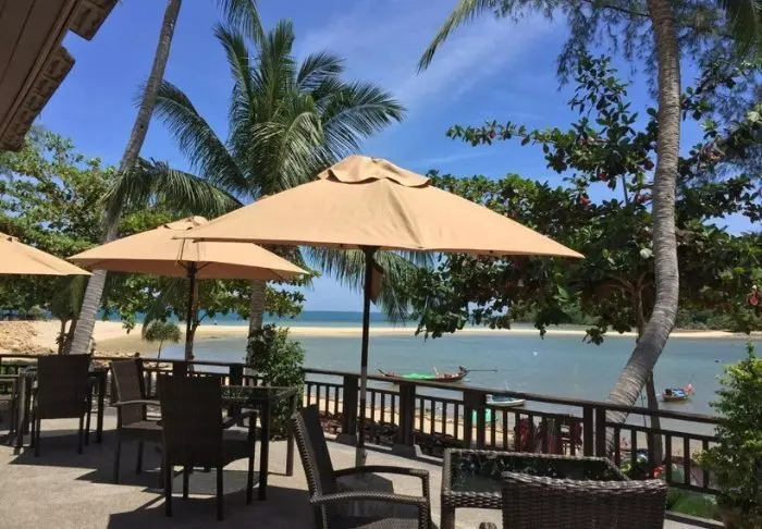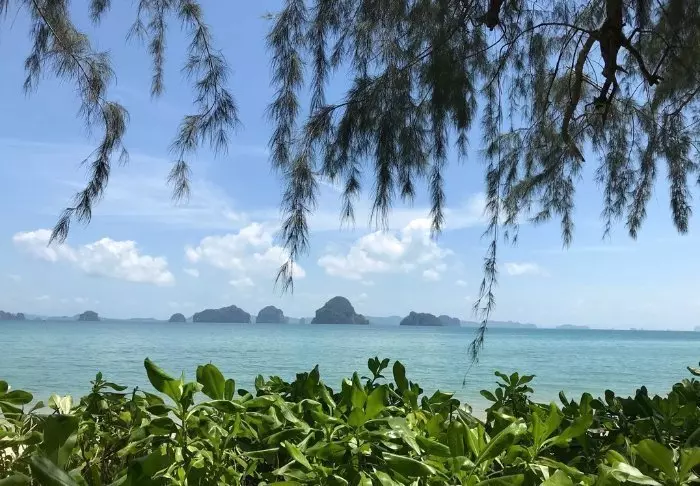 Stranden ligger bare et steinkast unna, og her kan du se de mange longtail-båtene som går i skyttelfart mellom Aonang og Railey. Fra stranden er det flott utsikt over Andamanhavet og de loddrette kalksteinsfjellene.