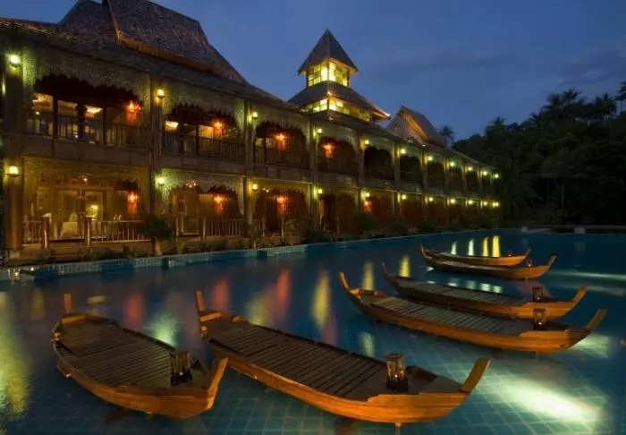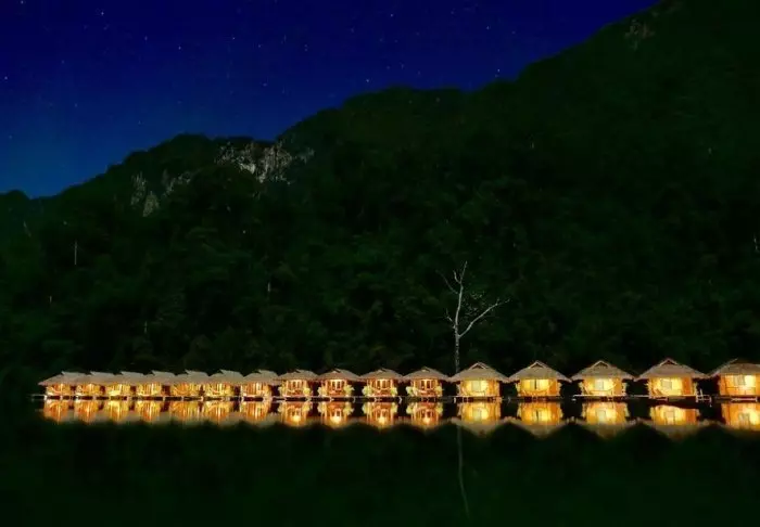Når nattens tropiske fløyelsmørke senker seg, blir lydene magiske og den romantiske stemningen smyger seg inn. Sikadene begynner å synge, mon-folket spiller musikk et sted i landsbyen og vannet klukker under flotellet, som kun er opplyst av oljelamper.