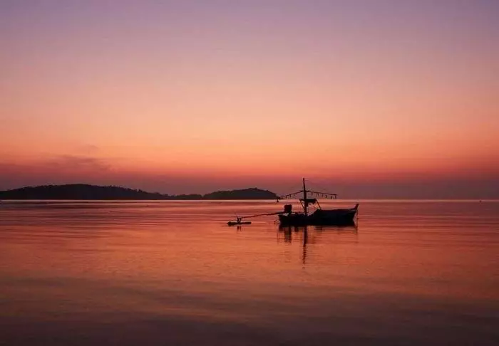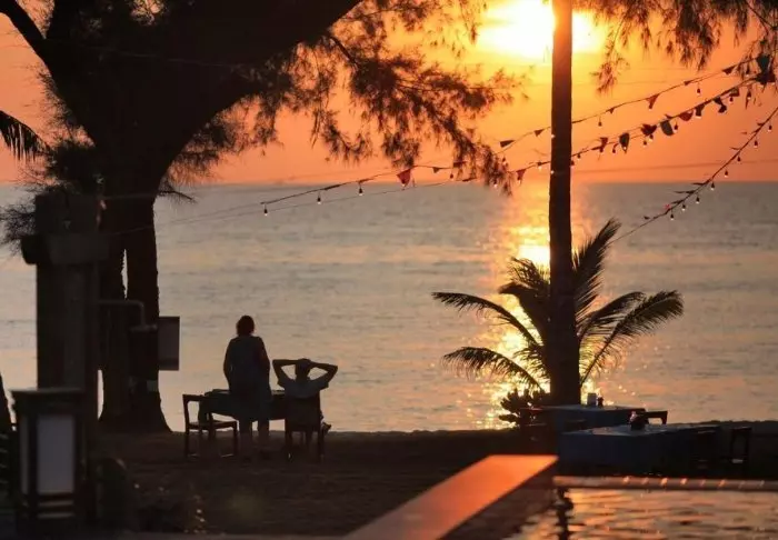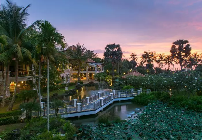 Solen er i ferd med å gå ned. Før du kler deg om til middagen tar du dagens siste dukkert i ”rooftop”-bassenget. Herfra kan du ane solen som er i ferd med å ned i Andamanhavet. Himmelen er rødlilla, og rundt deg synger sikadene.