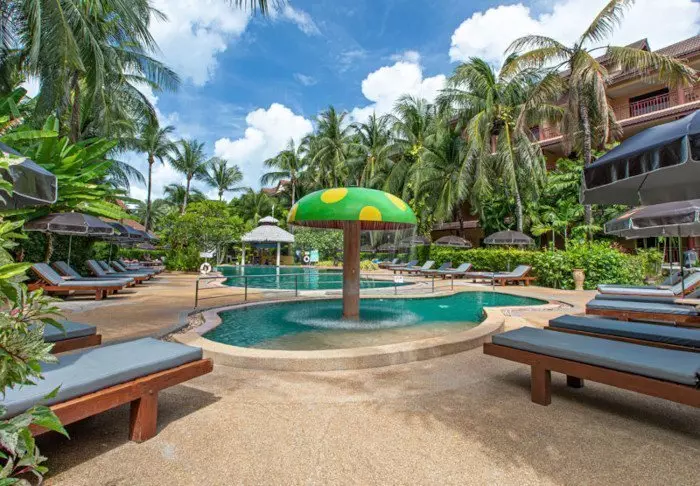 Rundt den tropiske hagen ligger svømmebassenget og barnebassenget, der du også finner solsenger.