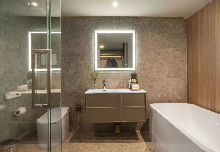 Rommene er moderne innredet i lyser farger og med tremøbler. Her er det både skrivebord og et lite sitteområde med sofa og sofabord. Alle rom har aircondition, safe, TV, minibar og et lite kjøleskap. På badet finner du hårtørker, toalettartikler, morgenkåpe og tøfler.