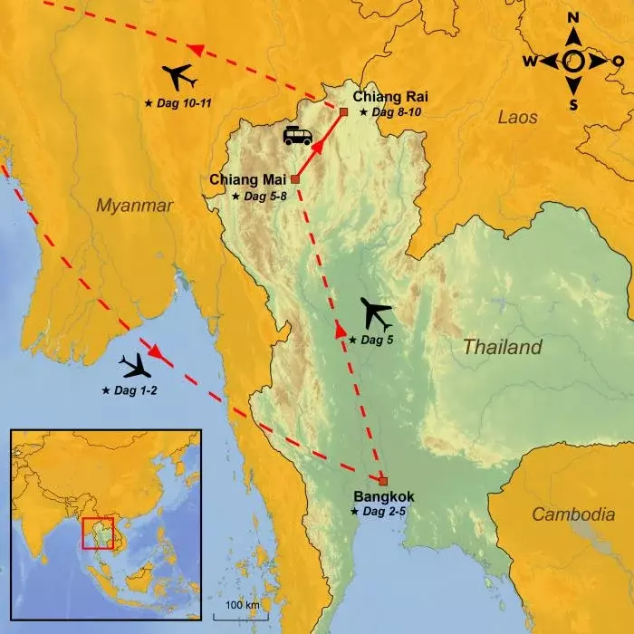 I dag reiser du fra hovedstaden Bangkok. Du blir hentet på hotellet og kjørt til flyplassen, hvorfra du flyr til Chiang Mai i det fjellrike Nord-Thailand. Flyturen tar ca. 1 time og 20 minutter.