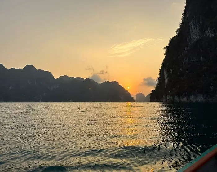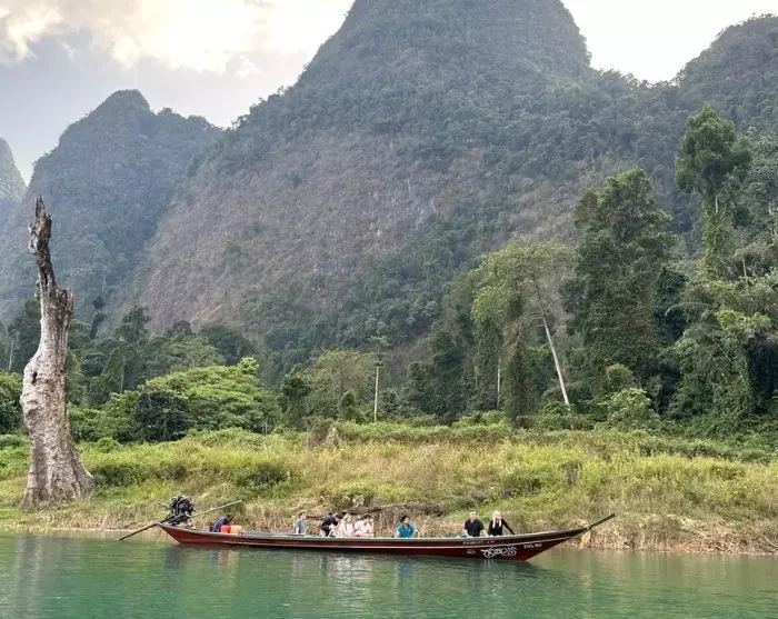 Deretter blir du kjørt til Ratchabrapa-bryggen nær den imponerende demningen. Her går du ombord i en longtail-båt og seiler ut på Cheow Lan-sjøen, der du kan beundre det majestetiske landskapet med ikoniske kalksteinsklipper.