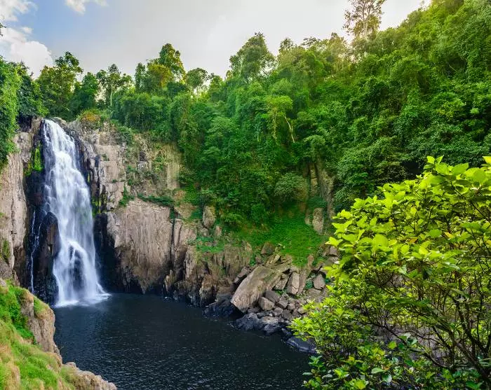 Deretter går turen tilbake til der dere startet, og dere kjører videre til Haew Narok-fossen, som er en av nasjonalparkens vakreste, og høyeste, fossefall med sine tre nivåer og en total fallhøyde på ca 150 meter. Fra parkeringsplassen og ned til fossen må du gå ca 1 km langs en natursti og ned trapper gjennom den frodige skogen. Vær oppmerksom på at det kan være veldig glatt i regntiden, og ruten egner seg ikke for personer med svekket førlighet til fots.