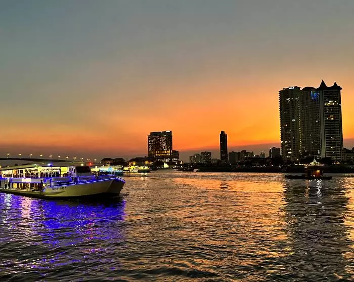 Kvelden avsluttes i en uformell takbar ved Chao Phraya-elven, med storslått utsikt over det opplyste Wat Arun-tempelet.
