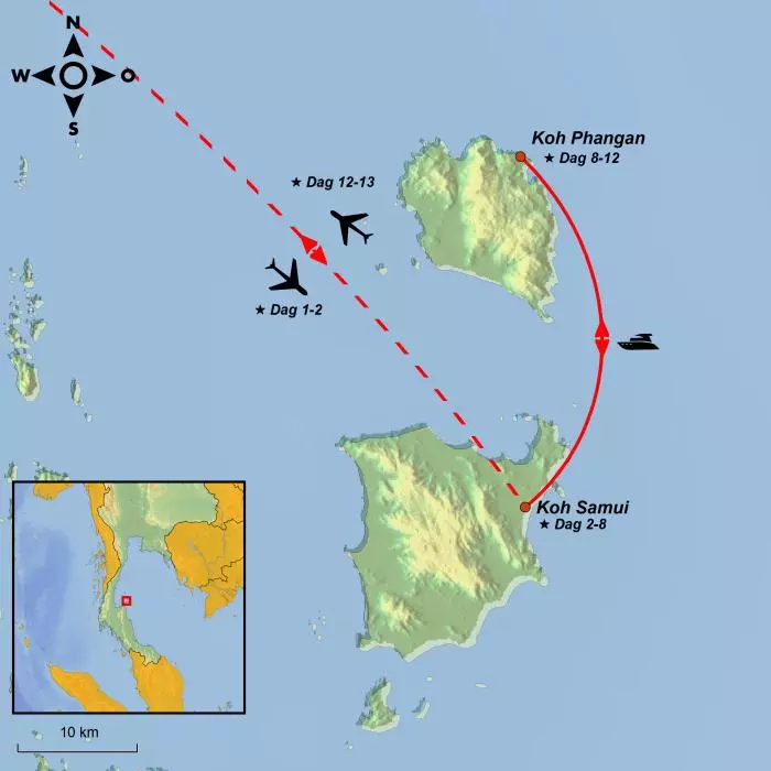 Du lander på Koh Samuis eksotiske flyplass, går gjennom immigrasjonen og henter bagasjen din. Utenfor ankomsthallen venter guiden din, kledd i TourCompass-uniform og med et TourCompass-skilt i hånden, slik at det blir enkelt for deg å finne ham eller henne. Herfra blir du kjørt til hotellet ditt som ligger på nordsiden av øya, i en rolig bukt ved Mae Nam-stranden.