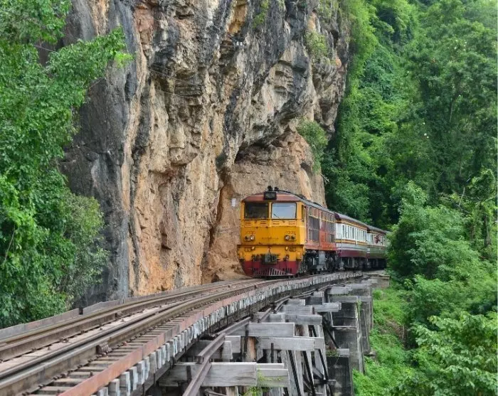 Du hentes på hotellet tidlig for å unngå den verste morgentrafikken ut av Bangkok, og blir kjørt direkte til Kanchanaburi og elven Kwae Yai. Under andre verdenskrig ble det bygget en jernbane her fra Thailand til Myanmar under umenneskelige forhold. Det tok 18 måneder å bygge den 415 km lange jernbanelinjen, og i løpet av denne perioden (1942-1943) døde ca. 100 000 asiater på tvangsarbeid og 12 500 allierte krigsfanger. Denne historien fra virkeligheten ble senere skildret i den berømte romanen Broen over elven Kwai av Pierre Boulle, og udødeliggjort i en filmatisering av boken.
