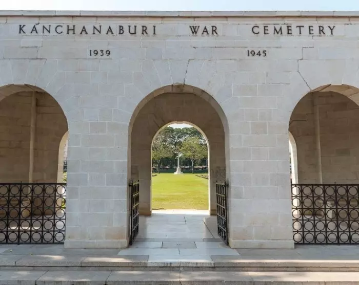 Du fortsetter til Kanchanaburi-krigskirkegården, et minnesmerke for mer enn 6000 allierte krigsfanger som døde under byggingen av jernbanen, og som ble flyttet til dette endelige hvilestedet etter krigen.
