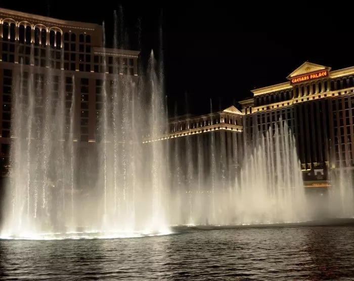 Når du ankommer temahotellet, er det vanskelig å la være å smile av synet av de mange blinkende «enarmede bandittene» der alle de håpefulle spillerne sitter og trekker i «armen» og håper på storgevinst. Sjekk inn på hotellet, ta en dukkert i bassenget og nyt en kveld på en av byens mange restauranter. Allerede i kveld kan du stoppe ved den berømte fontenen foran Bellagio-hotellet, som siden den åpnet i 1998 har levert imponerende vannshow til lyden av klassisk musikk for forbipasserende.