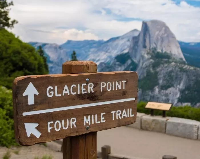 I sommermånedene, når snøen har smeltet, er Glacier Point et av utsiktspunktene du ikke bør gå glipp av. Du kan enten kjøre opp der med bil eller bestille en busstur til Glacier Point (bussturen bestilles mot et ekstragebyr direkte i parken. Her er det først til mølla-prinsippet som gjelder). Hvis du er klar for å legge videre ut på fottur fra utsiktspunktet, kan du også bestille en bussbillett opp til utsiktspunktet og gå ned via Four Mile Trail. Fra Glacier Point kan du også oppleve den eksepsjonelle solnedgangen når solen lyser opp det store fjellet Half Dome med en oransje glød.