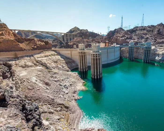 Cirka 3 kvarter før du kommer til Las Vegas, bør du ta en avstikker til den enorme demningen Hoover Dam. Demningen skjærer seg over Colorado-elven og er en imponerende konstruksjon med en høyde på hele 221 meter og en lengde på 379 meter. Den ligger rett på grensen mellom de to statene Arizona og Nevada. De har 1 times tidsforskjell, og dette markeres med en kjempestor klokke.