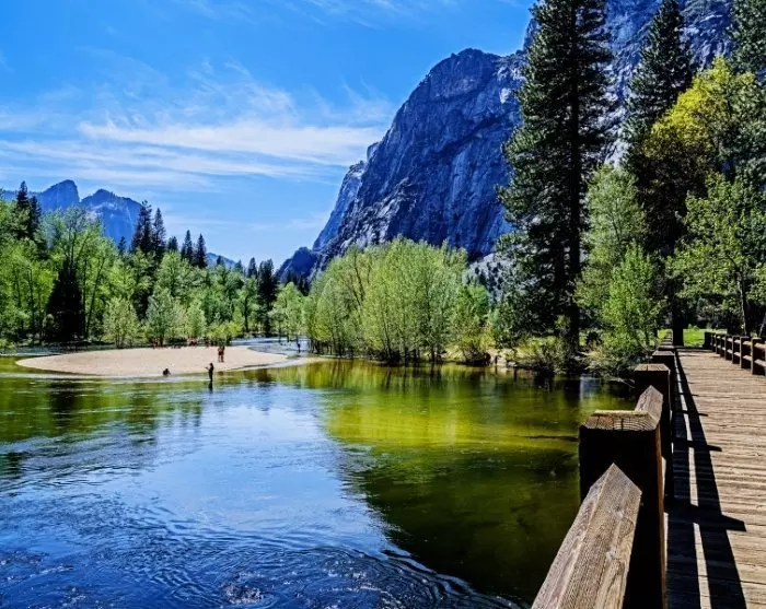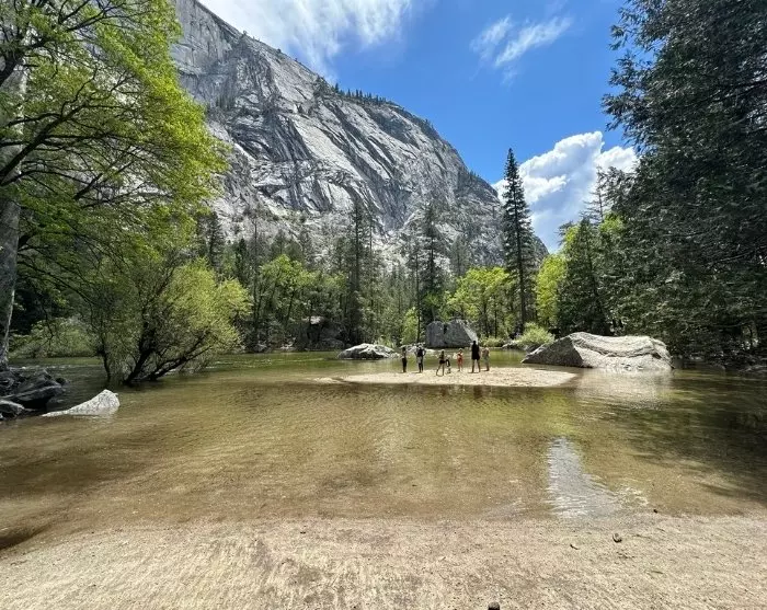 I Yosemite Valley er det også mulig å leie en sykkel. Du kan følge de asfalterte sykkelstiene fra det ene fossefallet til det neste, mens du bare tar inn synet av de store fjellveggene og trærne rundt deg underveis. Et fint sted å nyte en matbit er på den lille sandstrekningen ved Swinging Bridge Picnic Area, der du har utsikt mot fossen Yosemite Falls.