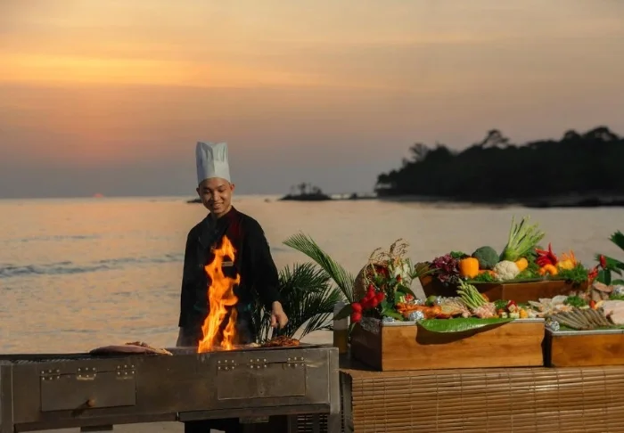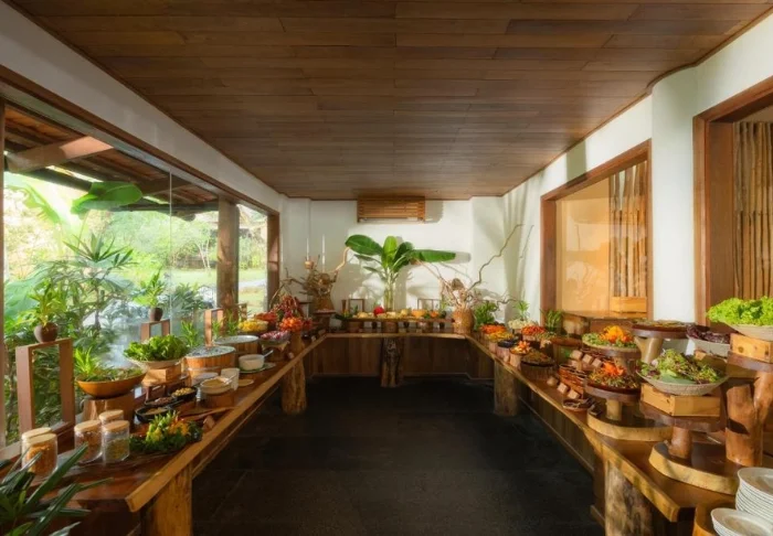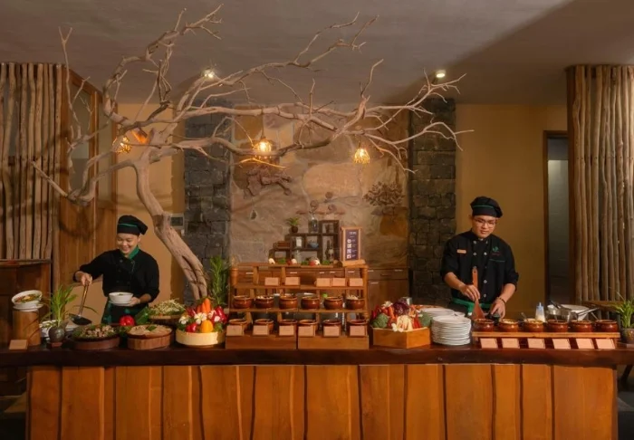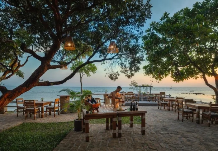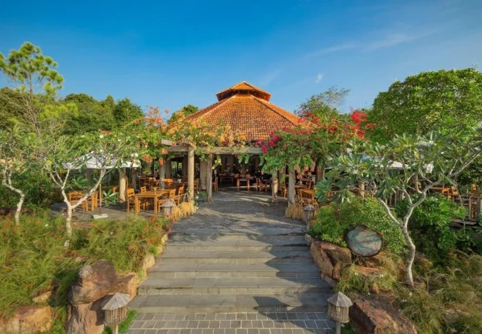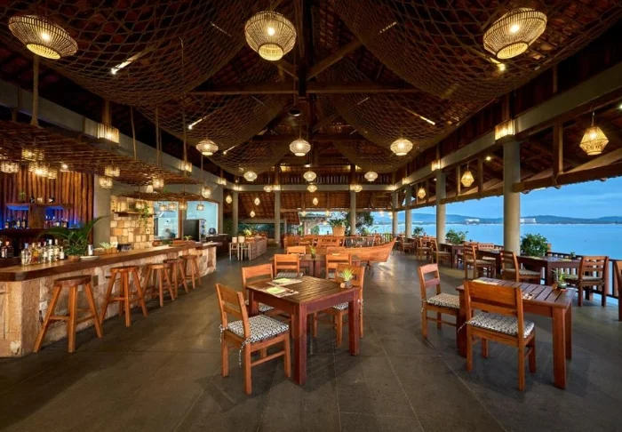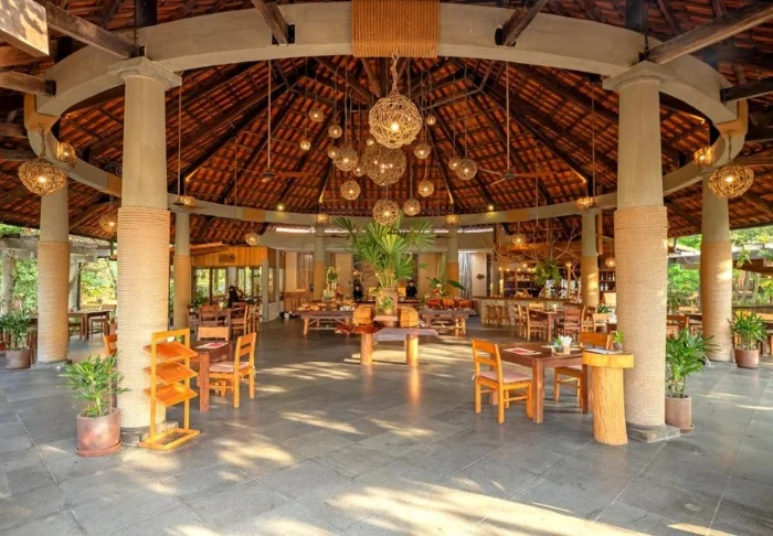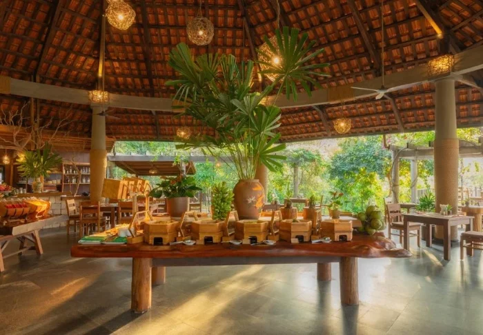 Resortet har tre restauranter. Hovedrestauranten Green Bay Restaurant er en utendørsrestaurant som serverer retter fra både Østen og Vesten hele dagen, i tillegg til lekre fisk- og skalldyrretter. Det er også her den overdådige frokostbuffeten serveres. Coral Bay Restaurant ligger ved vannkanten, og her får du snacks og små, sunne retter laget av lokale råvarer. Her kan du også nyte solnedgangen og drikke en «sundowner» på verandaen. Kveldens middagsservering har hovedvekt på det vietnamesiske kjøkkenet. I vannkanten ligger også Rock Bay Restaurant og bar med fokus på fisk, skalldyr, global gastronomi og cocktails. Felles for alle restaurantene er at de bruker økologiske ingredienser, blant annet urter og grønnsaker fra egen hage.