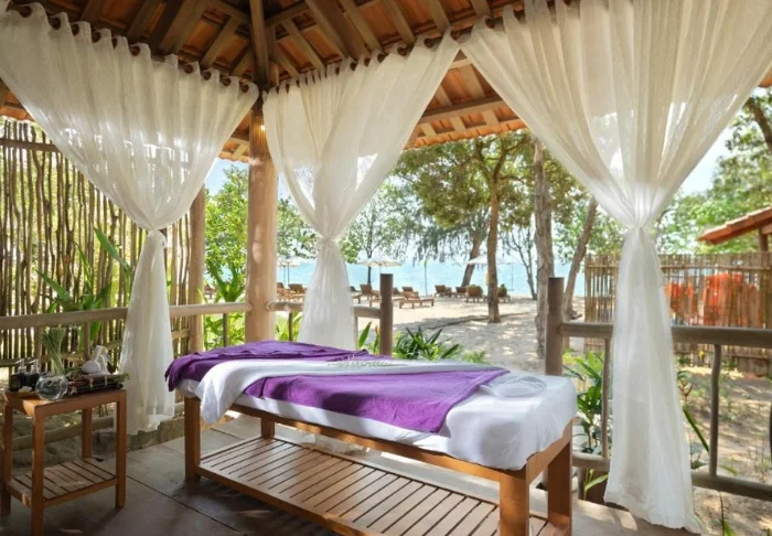 Etter en herlig dag i solen kan du skjemme deg bort med en avslappende behandling i spaavdelingen, som ligger spredt i små paviljonger med skjerming.