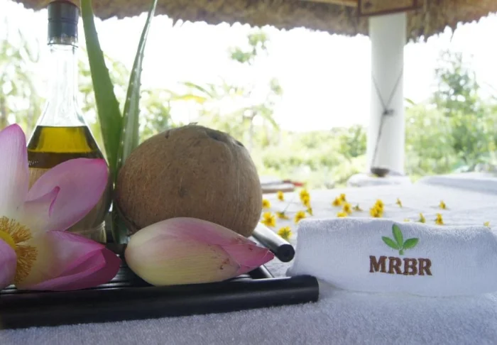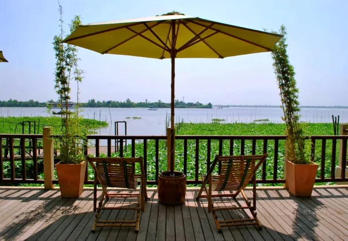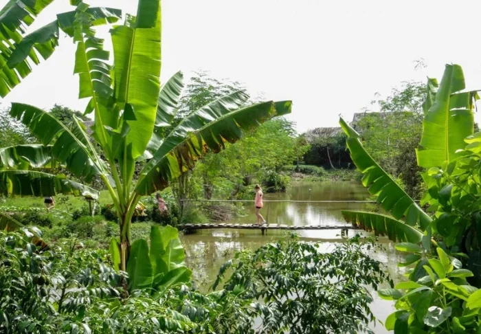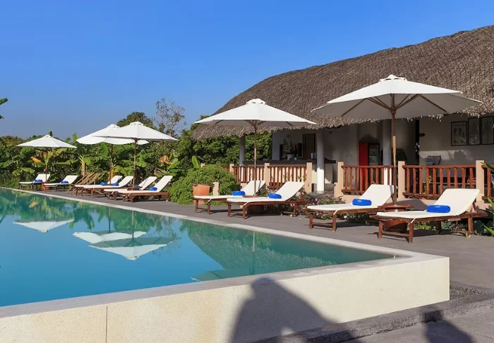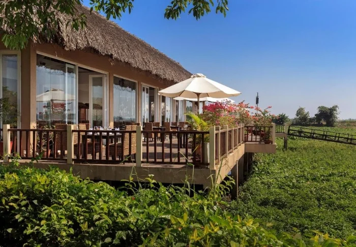 Resortets basseng har utsikt over elven, og her finner du både solsenger og parasoller. I Oasis Spa kan du nyte avslappende behandlinger omgitt av lotusdammer og frukttrær.