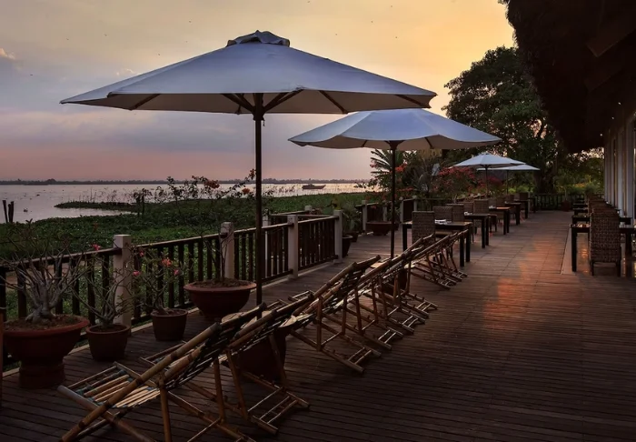 Dagen kan avsluttes med en drink i baren mens solen går ned over Mekong.