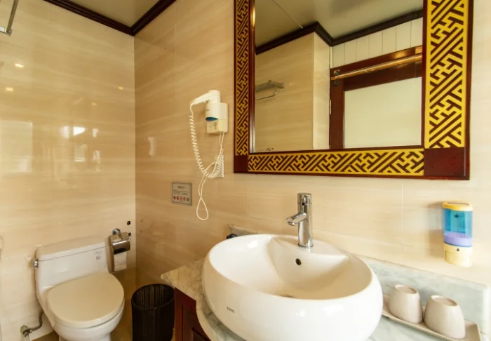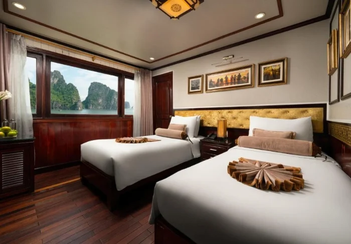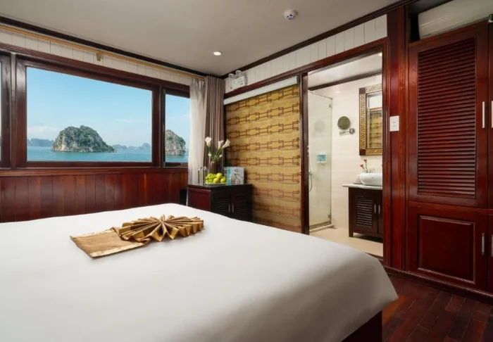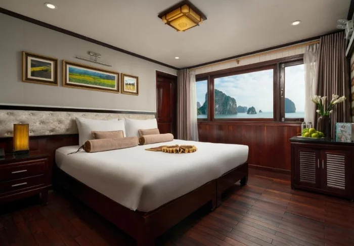 Skipet har 18 lugarer, og du bor som utgangspunkt i kategorien “deluxe”, som gir deg store vinduer med direkte utsikt mot vannet. Her kan du våkne til rolige bølgeskvulp og morgenlys over bukten. Lugarene er innredet med varme tresorter, myke gardiner, mørke tremøbler og klassiske detaljer i vietnamesisk stil. Her får du dobbeltseng eller to enkeltsenger, med mulighet for en ekstra seng til et barn under 12 år. Det er også aircondition, minibar, vannkoker til te og kaffe samt eget bad med dusj og toalettartikler. Rommene er enkle og intime, men har alt du trenger – og utsikten gjør det vanskelig å ønske seg mer.