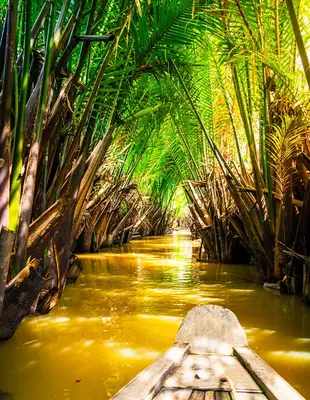 På en heldagstur kan du oppleve Mekongdeltaet fra en båt. Mekongdeltaet er et frodig område som dekker knapt 40.000 m2, der en stor del er dekket av vann. Mekongelven løper 4.500 km gjennom 6 land fra sitt utspring til deltaet ved kysten sør for Ho Chi Minh City. På seilturen kan du for eksempel besøke noen av de små lokale håndverkerne og produsentene og blant annet se en kokosnøttplantasje.