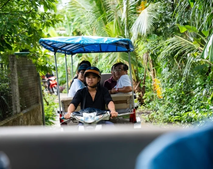 Du trenger ikke å dra langt ut av Ho Chi Minh City før landskapet begynner å forandre seg. Langs veien opplever du grønne rismarker og passerer små elver og kanaler som slynger seg gjennom det flate landskapet. Det er ikke uvanlig å se lokale bønder jobbe på markene, mens vannbøfler beiter langs veikanten og små salgsboder lokker med fersk frukt.