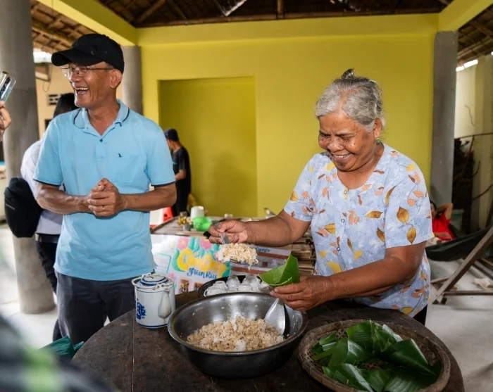 Tuktuken tar deg med gjennom landsbyens rolige gater. Første stopp er hos en lokal familie, hvor du får smake på com dep (grønne riskorn) og se hvordan popris blir laget.