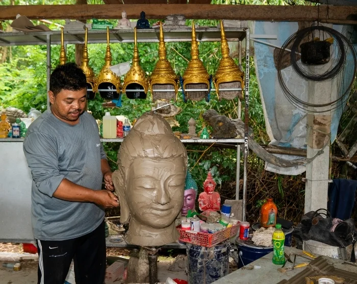 Turen går videre til en dyktig khmer-kunstner som lager statuer og masker til områdets pagoder.