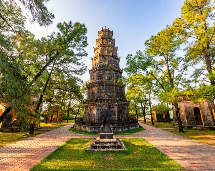 Neste stopp er Thien Mu-pagoden, Hués eldste og mest ikoniske religiøse landemerke. Pagoden ligger høyt oppe med utsikt over Parfyme-elven, og har i mer enn 400 år vært et viktig buddhistisk sentrum i det sentrale Vietnam. Det åttekantede pagodetårnet rager majestetisk mot himmelen og skaper en fredelig ramme rundt tempelet og klostersamfunnet som fortsatt lever og praktiserer her.