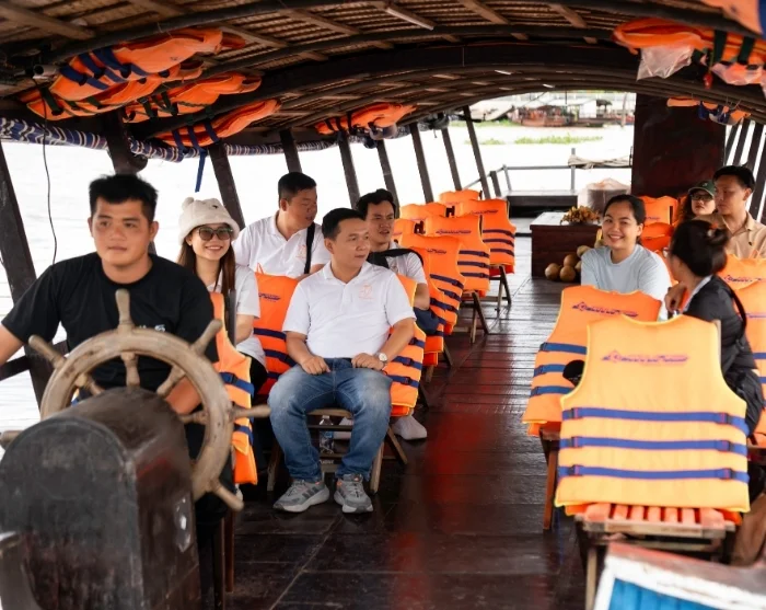 Etter cirka 2,5 timers kjøring ankommer du byen Cai Be. Her går du om bord i en båt og seiler ut på det frodige Mekongdeltaet. Du besøker lokale verksteder der dyktige håndverkere lager produkter av kokos. Deretter fortsetter du med en liten sampan – en tradisjonell, håndrodd trebåt – gjennom Mekongdeltaets smale, svingete kanaler.