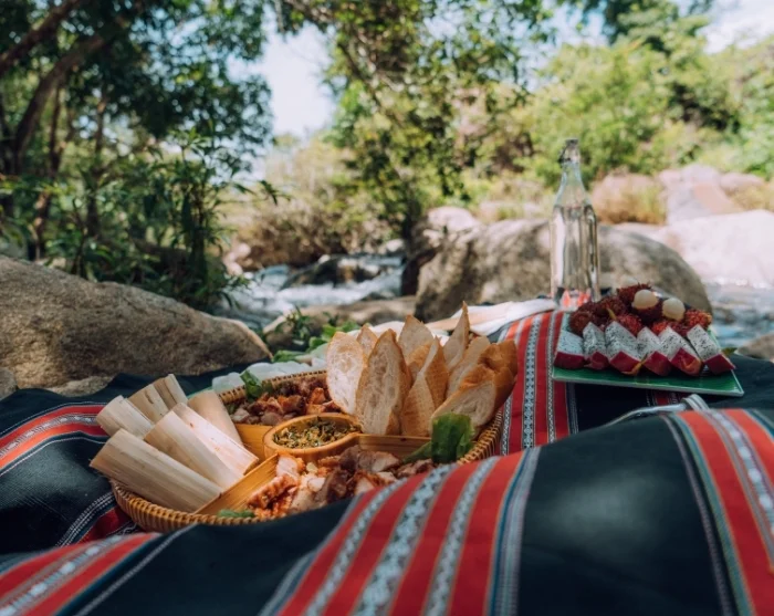Deretter legger du ut på en spennende fottur til Bim Bip-fossen, hvor du underveis kan nyte de vakre naturscenene. Ved ankomst venter en pikniklunsj med tradisjonelle retter pakket inn i bananblader – og kanskje frister det med et forfriskende bad i fossens naturlige basseng.