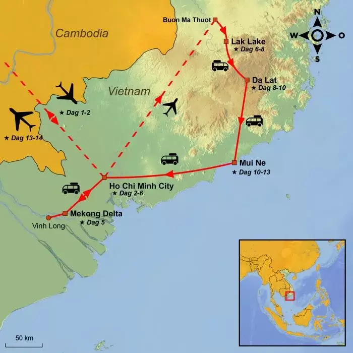 Du har dagen til fri disposisjon, frem til du om ettermiddagen blir hentet på hotellet og kjørt til den internasjonale flyplassen i Ho Chi Minh City, Tan Son Nhat. Herfra flyr du til Buon Ma Thuot i det sentrale høylandet, omtrent 350 km nordøst for Ho Chi Minh City. Flyturen tar ca. 1 time.