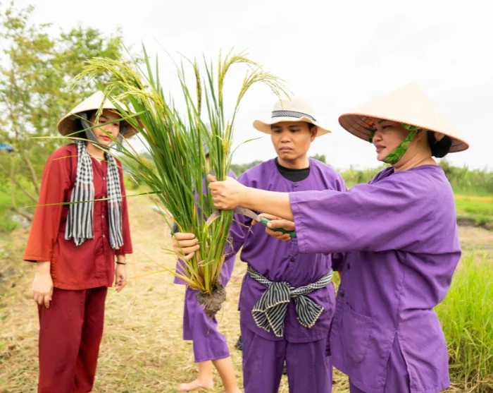 Deretter fortsetter du til vårt sosiale bærekraftsprosjekt i Vinh Long, som er etablert av vår lokale samarbeidspartner. Her venter en rolig spasertur gjennom landsbyen, hvor din guide gir deg innsikt i prosjektet underveis. Du får også mulighet til å ta del i det tradisjonelle landbrukslivet. Sammen med lokale bønder kan du prøve deg på risdyrking – enten ved å plante små risplanter eller bidra til innhøstingen, avhengig av sesong. Dette er en lærerik og jordnær opplevelse som gir deg et unikt innblikk i hverdagen på landsbygda i Vietnam og i arbeidet som ligger bak et bærekraftig jordbruk. Når du deltar på turen, bidrar du samtidig til å gjøre en forskjell for familiene i Vinh Long, siden en prosentandel av reisens pris går direkte til prosjektet, som du kan lese mer om her.